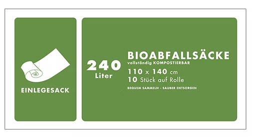 Bio-Abfallsäcke 240 Liter 110 x 140cm aus kompostierbarer Maisstärke (Einlegesack) DIN zertifiziert nach EN 13432, 15 Rollen á 10 Stück im Karton