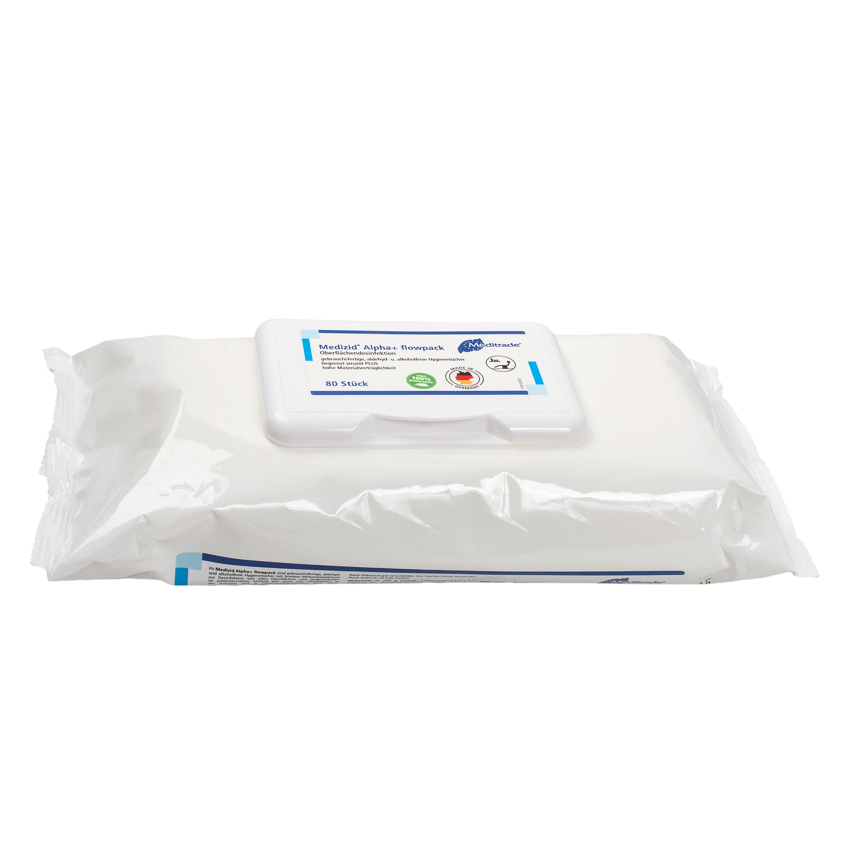 Desinfektionstücher Medizid Alpha+ Flowpack 80 gebrauchsfertige Tücher aldehyd-, und alkoholfrei 22 x 20cm je Tuch, 12 Packungen im Karton